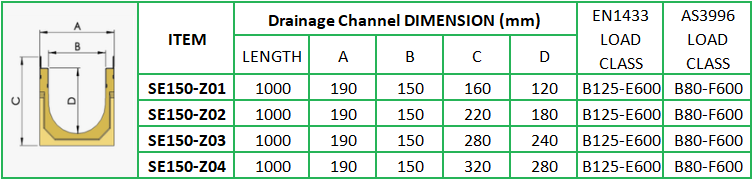Product description: Clear opening = 150mm with steel egde polymer concrete drainage channel