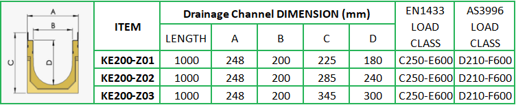 Product description: Clear opening = 200mm with cast iron egde polymer concrete drainage channel